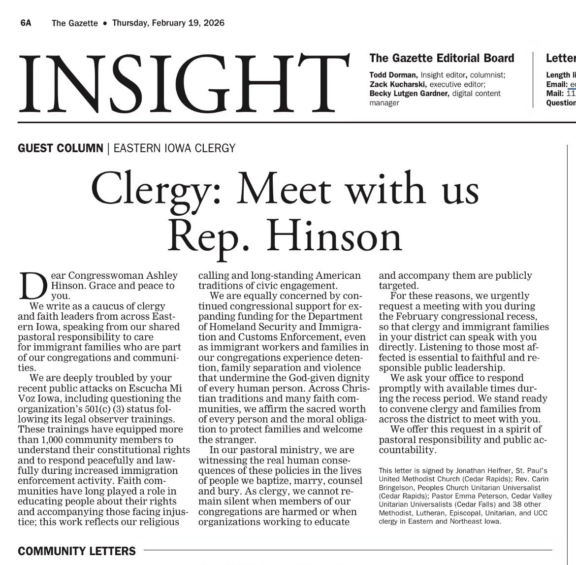Peoples Church is featured in The Gazette along with forty-two other clergy and congregations in an article titled “Clergy: Meet with us Rep. Hinson” published Thursday, February 19, 2026.